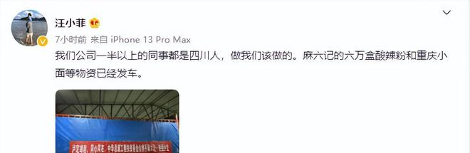 汪小菲发文透露其公司向四川震区捐赠物资,并表示“我们公司一半以上的同事都是四川人,做我们该做的。麻六记的六万盒酸辣粉和重庆小面等物资已经发车。”