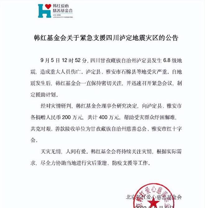 韩红旗下的基金会分别向泸定、雅安分别捐赠200万元用来帮助受灾群众纾困解难,共计400万元。不仅如此,韩红基金会还将持续关注灾情,根据实际情况尽全力协助灾区进行重建、防疫支援等工作。