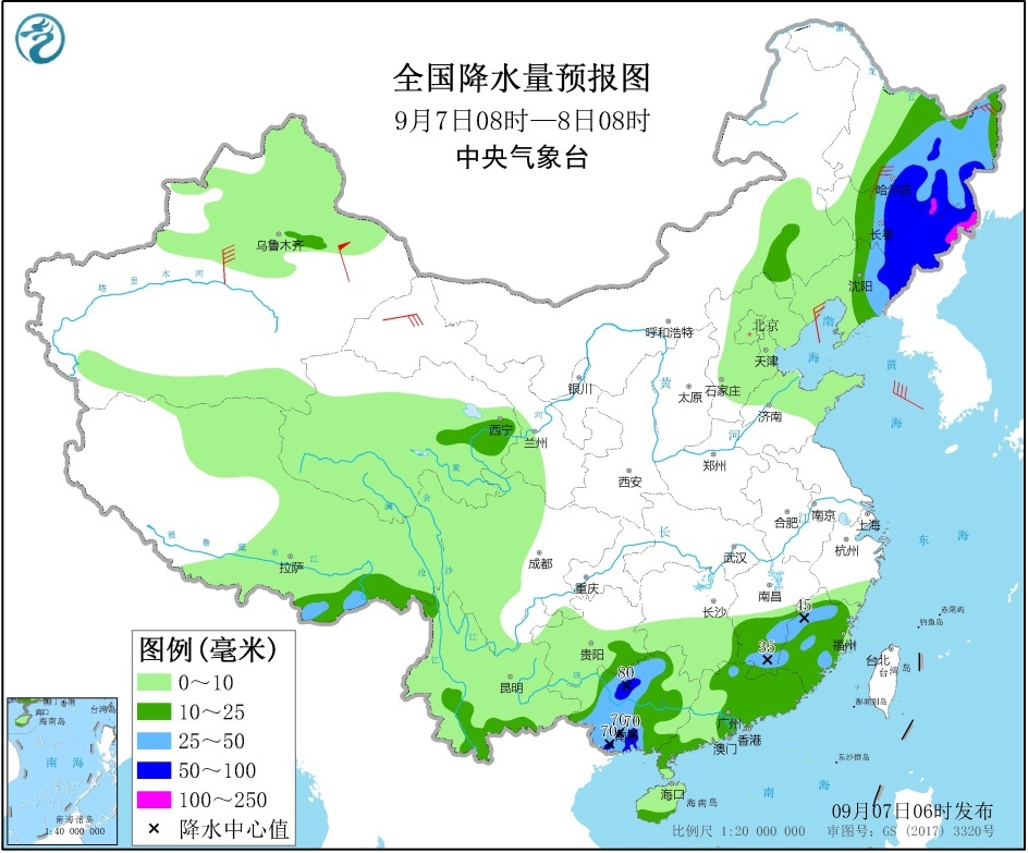 9月7日08时至8日08时,东北地区中东部、江南南部、华南大部等地部分地区有中到大雨,其中,黑龙江东南部、吉林中东部、辽宁东部、广西中部等地部分地区有暴雨或大暴雨(100~130毫米)。黑龙江西南部和东北部、甘肃河西等地部分地区有4~6级风,其中,新疆南疆盆地部分地区有6~7级风,新疆东部部分地区有7~8级风(见图2)。此外,黄海中部和南部海域、东海北部海域将有6~8级、阵风9~10级的大风。