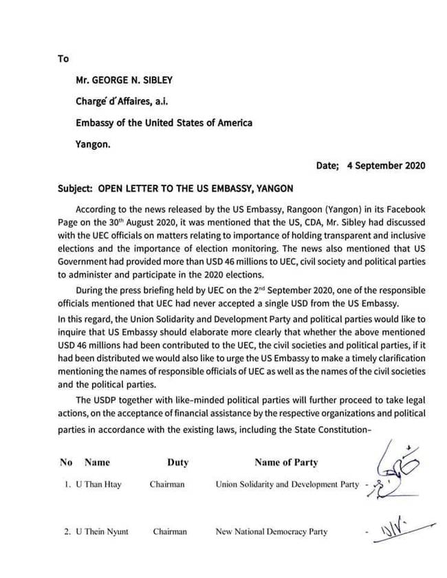 原标题:缅甸25家政党联合发表公开信质疑美国所宣称的大选援助资金去向