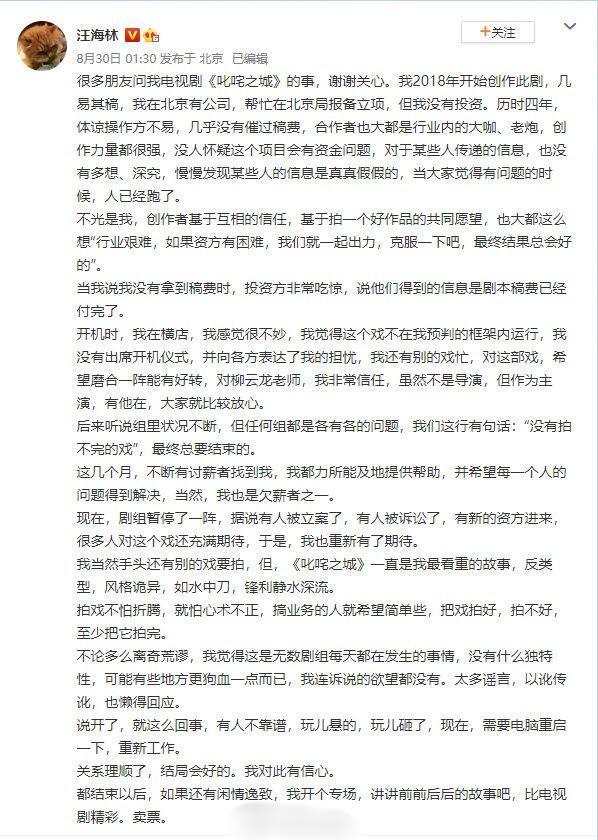 据了解,8月30日,编剧汪海林在社交平台发长文,称自己提供的剧本没拿到稿费,剧组不拥有版权。