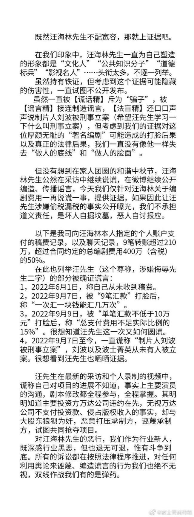 同时波士菁英传媒也晒出与汪海林的聊天记录和转账记录,证明并不存在拖欠稿费等现象,9笔转账超过210万,超过合同约定的总编剧费用400万(含税)的50%。从聊天记录中可以看到,汪海林执意要求打款到他的美国账号上。