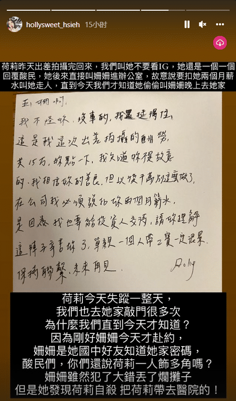 因何莉不堪被网暴,于是就有了“8月22日凌晨轻生”一事,而她的朋友也出面解释,称骗子不是荷莉,而是荷莉助理珊珊,甚至还表示在辞退对方时,还因为考虑到对方年纪小,专门补了对方不少钱。