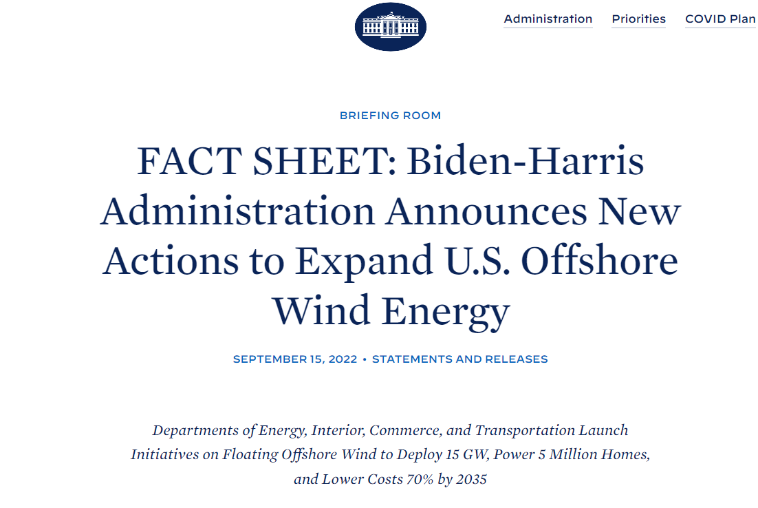 白宫官宣“2035浮动海风发电”目标 将推动发电成本下降70%