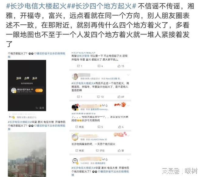 为了证实网友的疑虑,小编也第一时间询问了在长沙当地的朋友,他说确实有3个地方起火,但是没有4个,就在他家附近,也不是开福寺和湘雅医院起火,就是那附近的一个废品回收站起火,还有就是电信大楼,和星沙开元东路安能物流园。
