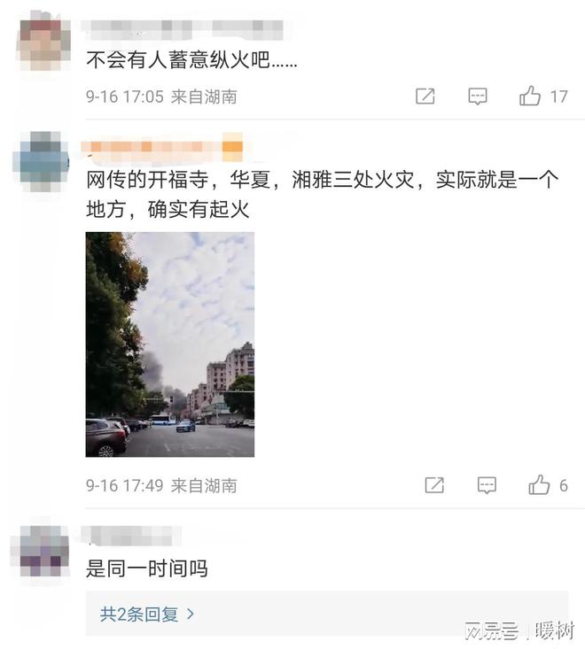 但是传言刚出,就立马有知情的网友在网上辟谣,称就两个地方起火,湘雅,开福寺,富兴,远点看过去就在同一个地方,别人的朋友圈表述不一致,其实都在起火点附近,就别再传4个地方起火了。