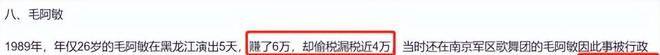 7、毛阿敏作为老一辈影响比较大的代表。因为两度被发现“漏税”行为,虽然补交了税金,但是对她造成的名誉影响很大,一度使得她的演唱事业搁置。一次是1989年,她赚了6万,但偷税漏税近4万,当时这笔数目可不小,第二次在1996年,补交的税金27万。