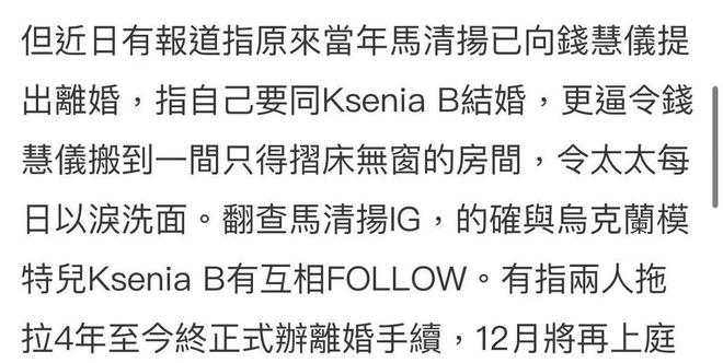 之后更是有八卦媒体报道,马清扬曾提出过离婚,以便能够正大光明地和那位模特在一起。