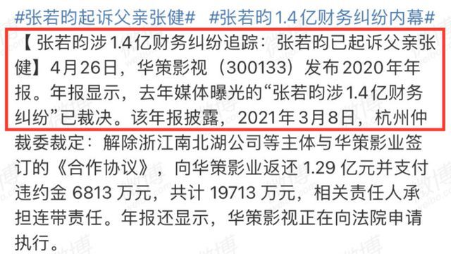 此前,张若昀曾与张建方的华策影业签订《合作协议》而涉1.4亿财务纠纷被裁定赔偿违约金近2亿,而后,张若昀方称《合作协议》签名系伪造,两度向仲裁委提出管辖异议却都被驳回。今年4月,张若昀以委托合同纠纷为由,向浙江省海盐县法院正式起诉父亲张健及浙江南北湖梦都影业有限公司。