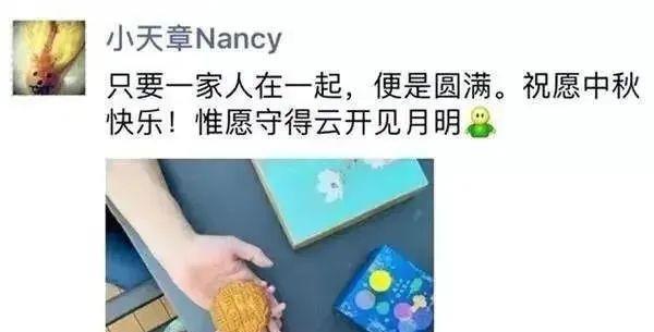 “只要一家人在一起,便是圆满。祝愿中秋快乐!惟愿守得云开见月明。”