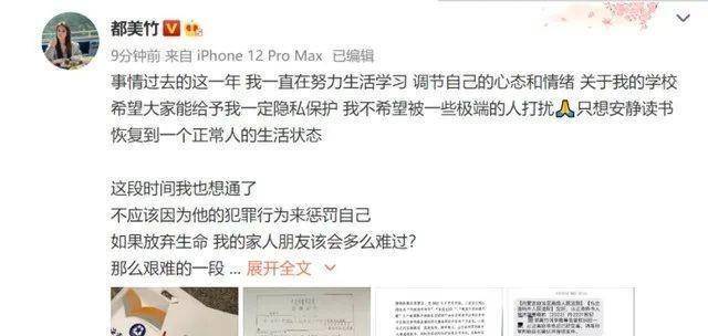 时间回到去年,都美竹从在读的大学退学,也在微博发声说,是因为想要离开北京去上海。