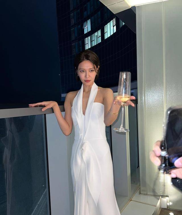 公开的照片中,少女时代秀英身穿白色紧身露肩晚礼服,显出窈窕身材,手拿酒杯站在酒店阳台上,身穿一袭耀眼的白色连衣裙,营造出优雅天真的气质,展现出崔秀英迷人的美貌。