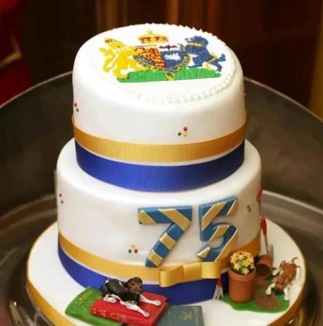 蛋糕是定做的,皇冠的徽记用金色和蓝色勾勒出来,蛋糕的底部是几本书的雕塑,还有她和查尔斯共用的杰克罗素梗犬。