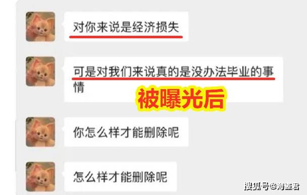 在被曝光之后,两个女生一点“知错”的态度都没有,让“枪手”删除曝光的帖子时居然表示:对你来说是经济损失,对我们来说是没办法毕业的事情。