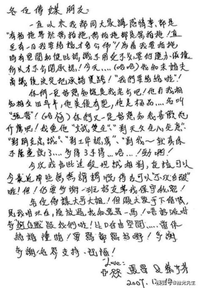 2004年,二人恋情曝光,跟很多“女强男弱”的组合一样,一个是当红女星,一个名不见经传的小武指,他们也不被看好,外界对张晋的嘲讽声不绝于耳。但蔡少芬认定了张晋,多年的相处早已对他至爱至深,于是2007年她手写了一篇公开信,信中对张晋百般夸赞,也一再表明自己的决心。
