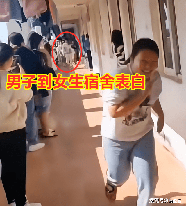 一学校内,一名男子拿着花到女生宿舍表白,引起女生集体围观。