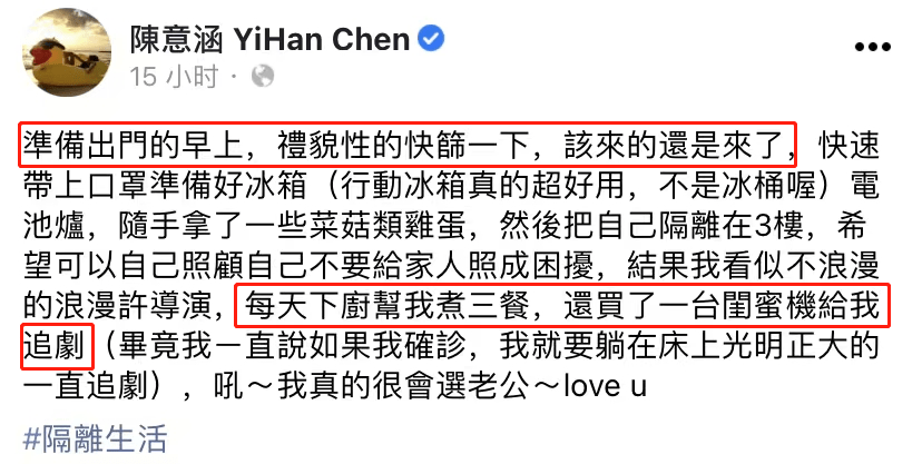 发文中,陈意涵称自己在发现确诊新冠后,为了不给家人添加麻烦,就自己单独隔离了起来,准备自己照顾自己,但老公担心自己吃不好,就每天帮自己做好一日三餐,还给她买了一台专门追剧的手机。