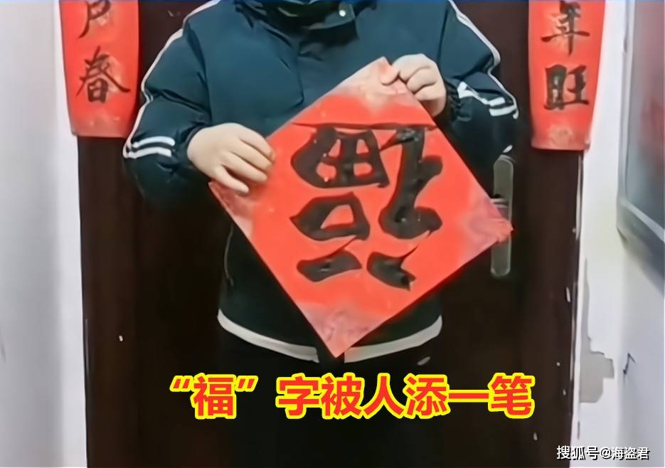 一名男子在自家门上贴了一个“福”字,意外发现“福”字被熊孩子给添了一笔。