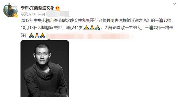 著名舞蹈演员王迪意外去世!年仅44岁,曾与杨丽萍合作《雀之灵》