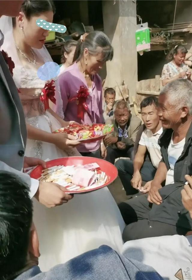 按照当地风俗,婚礼现场除了跪拜高堂之外,还有一个环节就是给长辈发烟,发喜糖,长辈会回礼红包,这个环节往往都是男性长辈参加。