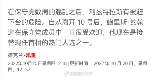 至于特拉斯的外交政策,更缺乏评价的可能性。毕竟一个连俄罗斯地理都缺乏常识的人,可能没有一种正常的国际关系认知。或者更严肃地说,特拉斯的执政时间之短暂,以至于使我们缺乏窥探她完整外交政策的素材。保守党的支持率也迅速掉到了22%。如果今天举行大选,那么保守党很有可能会遭受建党以来的最大惨败。其惨烈程度绝不会逊于上次大选中工党的拉胯程度。