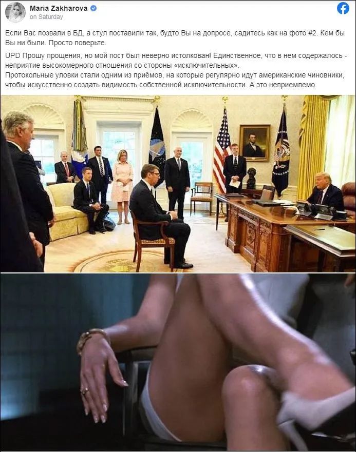 9月5日,也就是塞尔维亚总统武契奇与科索沃“总理”签署了经济正常化协议的次日,俄罗斯外交部发言人扎哈罗娃在其个人的脸书账号上,发布了武契奇正坐在特朗普对面的照片,还配上一张电影《本能》的剧照并刊文称:
