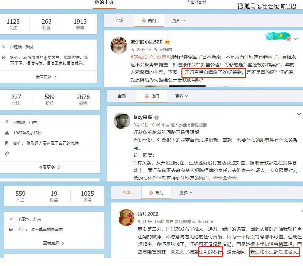 不知是不是巧合,刘鑫的每篇博文下面都有大量水军攻击江歌的母亲,称她吃女儿的人血馒头,更有甚者说她收到20亿捐款,还有人说她嫁了四五次,还骗了12万彩礼。