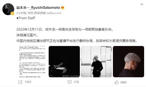 10月25日,癌症晚期的音乐家坂本龙一的员工代他在社交平台发文称,“2022年12月11日,坂本龙一将面向全球举办一场钢琴独奏音乐会”,“这次音乐会除了日本,还将同时在全球二十多个国家和地区上线”,“目前正在和中国的直播平台进行最终协调,近日将提供票务服务”。