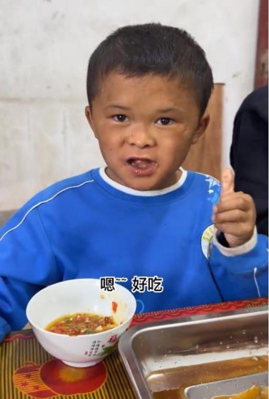 范小勤吃的满嘴是油,还竖起大拇指,连连称赞“好吃”。