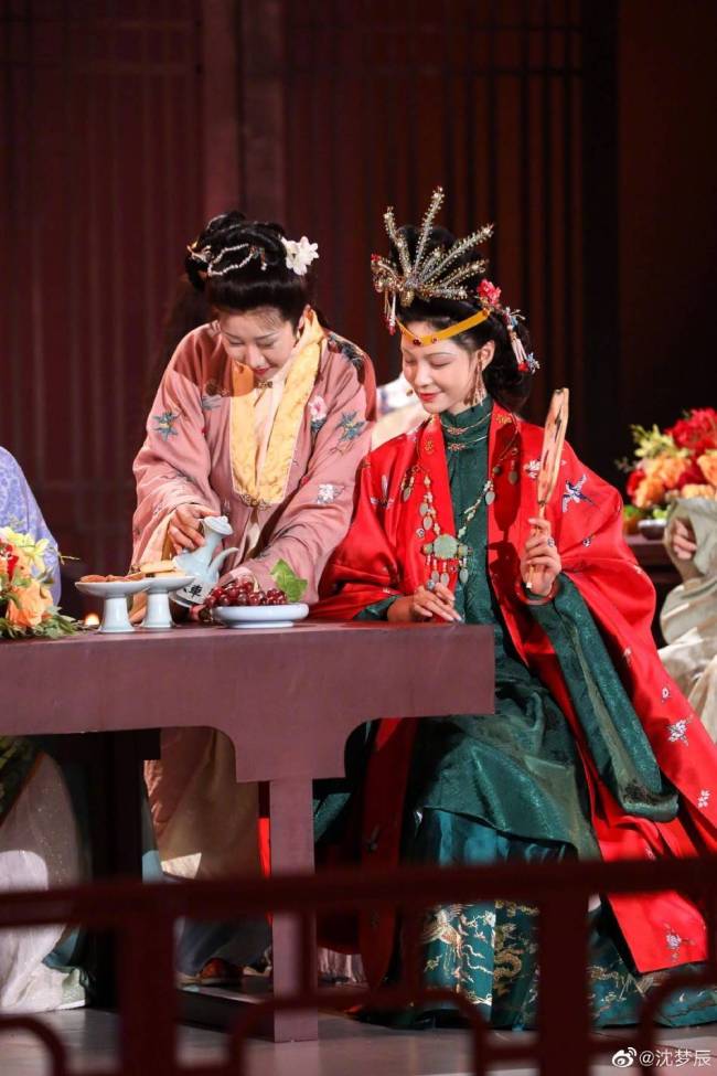 沈梦辰一身红色古装大衣,她俏脸成熟妩媚,眉清目秀,烈焰红唇,她头戴各种发钗,美得让人心动。
