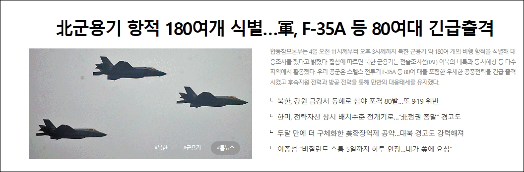(观察者网讯)据韩联社韩联社11月4日报道,韩国联合参谋本部(联参)4日表示,韩军方从当天上午11时许至下午3时许捕捉到朝鲜出动约180架战斗机的航迹信息后,紧急出动F-35A隐形战机等80多架军机予以应对。