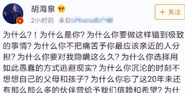 事情发生后,胡海泉在微博上用连续多个为什么公开喊话陈羽凡,言辞中透露着震惊、失望和恨铁不成钢。作为多年好兄弟,骤闻噩耗,受到打击当然都是正常的,但问题是明明有更便捷的联系方式,胡海泉却选择了在公开的社交平台喊话。