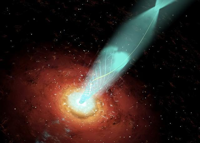 当它疯狂吞噬星系中的物质时,就好像从周围圆盘或球状的电离气体里,汲取了充足的“燃料”,然后铆足了劲,以惊人的速度其喷射而出。