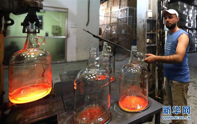 这是9月12日在黎巴嫩北部城市的黎波里一家玻璃制品厂拍摄的烧制完的玻璃制品。