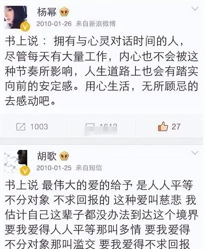 然而这还不算完,在那个拿社交平台当朋友圈发的年代,胡歌与杨幂的发文,也充满了暧昧的气息。