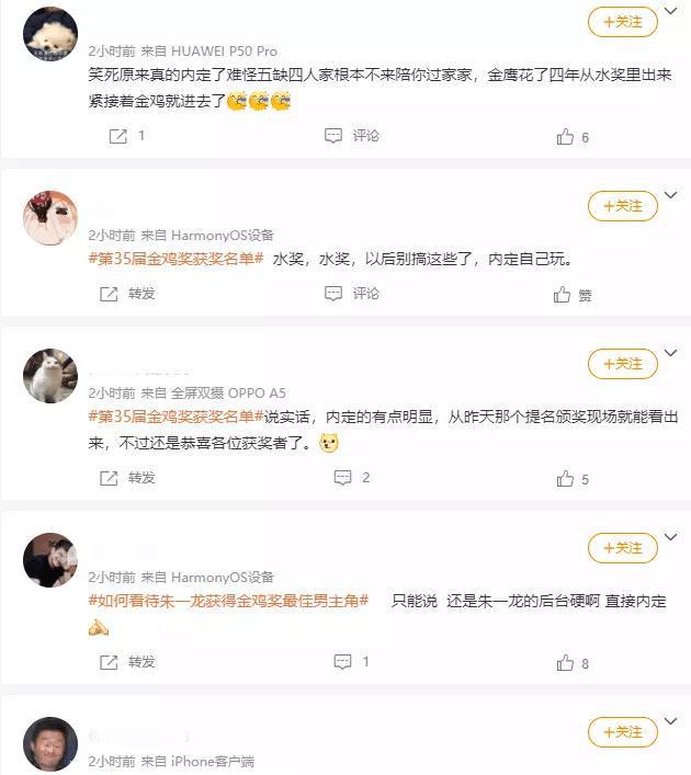 而在朱一龙夺奖后,似乎一夜之间,冒出了大量沈腾、徐峥、吴京、易烊千玺这些朱一龙竞争对手的粉丝,为他们“鸣不平”,信誓旦旦称5个提名者,现场就来了2个,吴京还是已经拿过影帝的,明显是“内定”朱一龙了。
