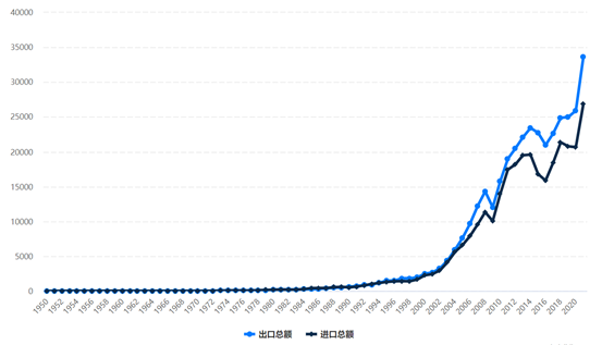 每年出口增速高达20%以上,带动了国内经济的高速发展,如下图在2001年我国出口金额还只有2660.98亿美元,