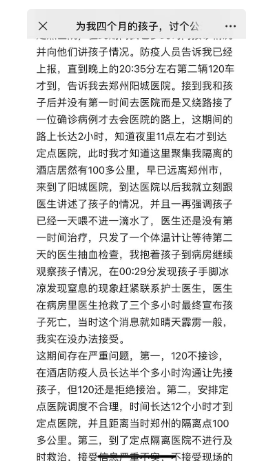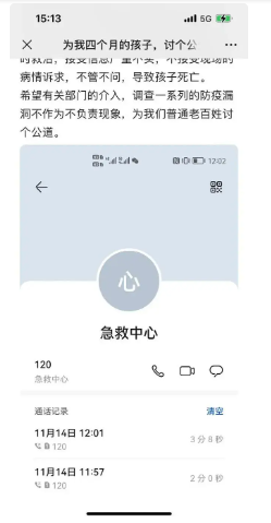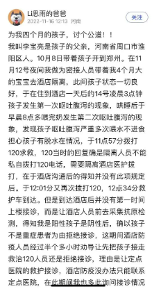 四个月前,视频中的女子与丈夫李先生迎来了人生中最美丽的天使——女儿思雨。 在这一百多天的时间里, 一家三口享受着无尽的人间天伦。 直到11月12日,李先生的妻子核酸检测阳性,被送到方舱医院,而他和4个月大的女儿作为密接者,被送到郑州市金水区未来路的中州国际饭店进行隔离。 11月14号凌晨3点,女儿开始呕吐腹泻, 早晨8点多喂完奶后,再次呕吐腹泻不止, 并且水、奶都喂不进去,大有脱水迹象。 眼看孩子危急,孩子爸爸中午11点57分拨打了120求救,而120当时的回复竟然是: 隔离人员不能私自拨打120,需要隔离酒店医护拨打。 李先生在与酒店沟通后得知并没有此项规定。 于是,李先生12:01分再次拨打了120, 半小时后救护车到达。 然而,救护车到达酒店后并没有第一时间上楼接诊处置,而是让酒店人员前去采集抗原检测。