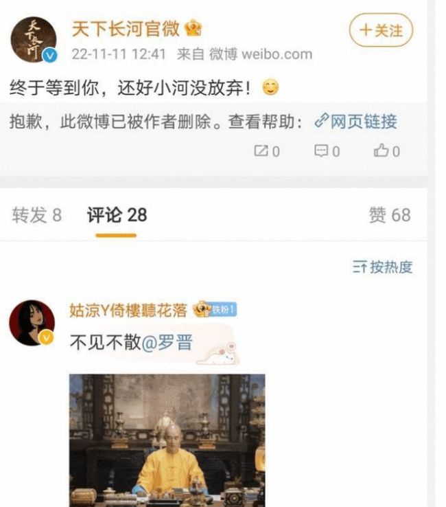 继罗晋在社交平台发声后,网友发现他更是将新剧《天下长河》有关的动态全部删除。