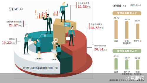 据此前发布的《2021年北京市人力资源市场薪酬大数据报告》显示,2020年度行业薪酬中位值排名前五位的依次也是货币金融服务(28.54万元)、资本市场服务(27.06万元)、互联网和相关服务(21.01万元)、新闻和出版业(20.25万元)、保险业(17.54万元)。