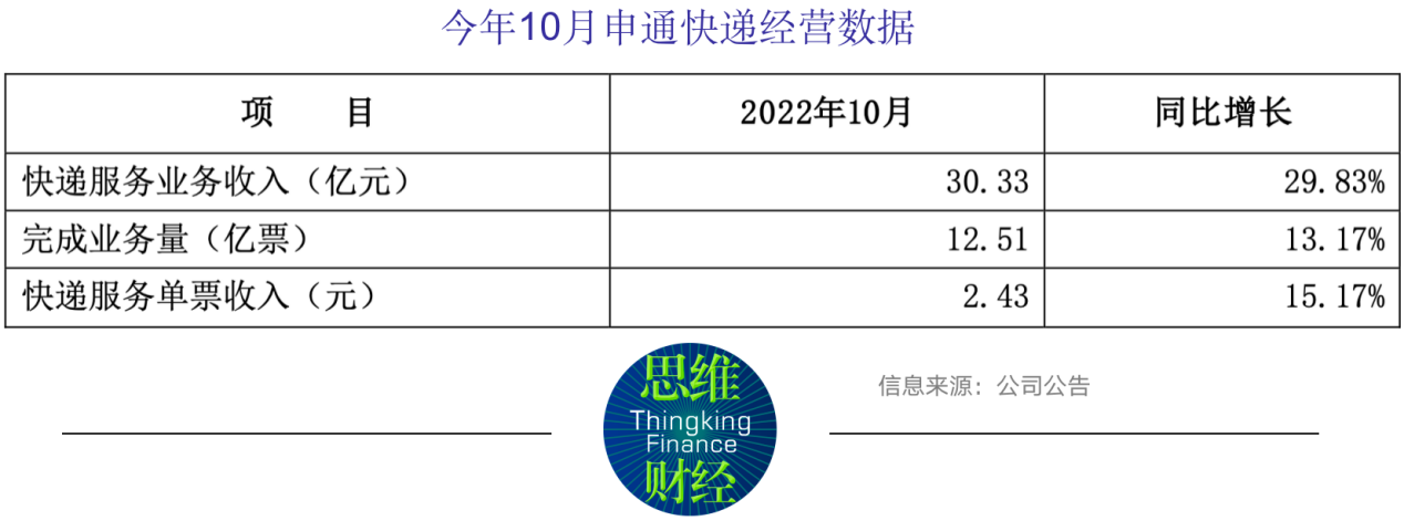11月19日,申通快递股份有限公司(以下简称“申通快递”,002468.SZ)发布了今年10月经营简报,其中快递服务业务收入约30亿元,同比增长近30%;完成业务量12.5亿票,同比增长约13%;快递服务单票收入2.43元,同比增长15.17%。