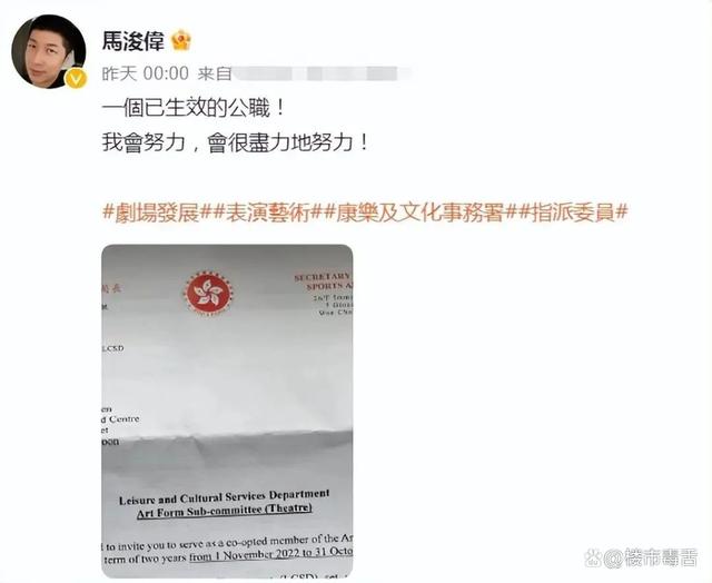 从曝光的任职书可以看出,马浚伟已经就职于香港艺术发展局,担任戏剧类委员,负责给演艺节目的规划、资源分配问题提供专业意见。