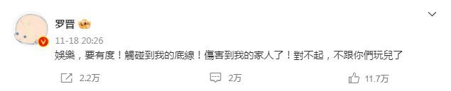 可在刚刚开播那两天,由于某段剧情的因素,网络上也出现了“罗晋新剧老婆被群嘲”的热搜词条,原本也只是配合着该剧的宣传,但是很快却发展成为了“唐嫣被群嘲”的热搜。这也让罗晋当场发飙了,在社交平台上直接发文:“娱乐,要有度!触碰到我的底线!伤害到我的家人了!对不起,不跟你们玩儿了”,高调护妻的行为也赢得了大家的赞赏。