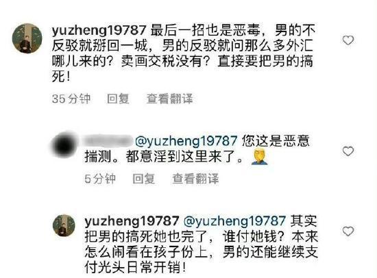 同时,于正还在评论区表示“最后一招也是恶毒,男的不反驳就掰回一城,男的反驳就问那么多外汇哪儿来的?卖画交税没有?直接要把男的搞死!”,“其实把男的搞死她也完了,谁付她钱?本来怎么闹看在孩子份上,男的还能继续支付光头日常开销!”