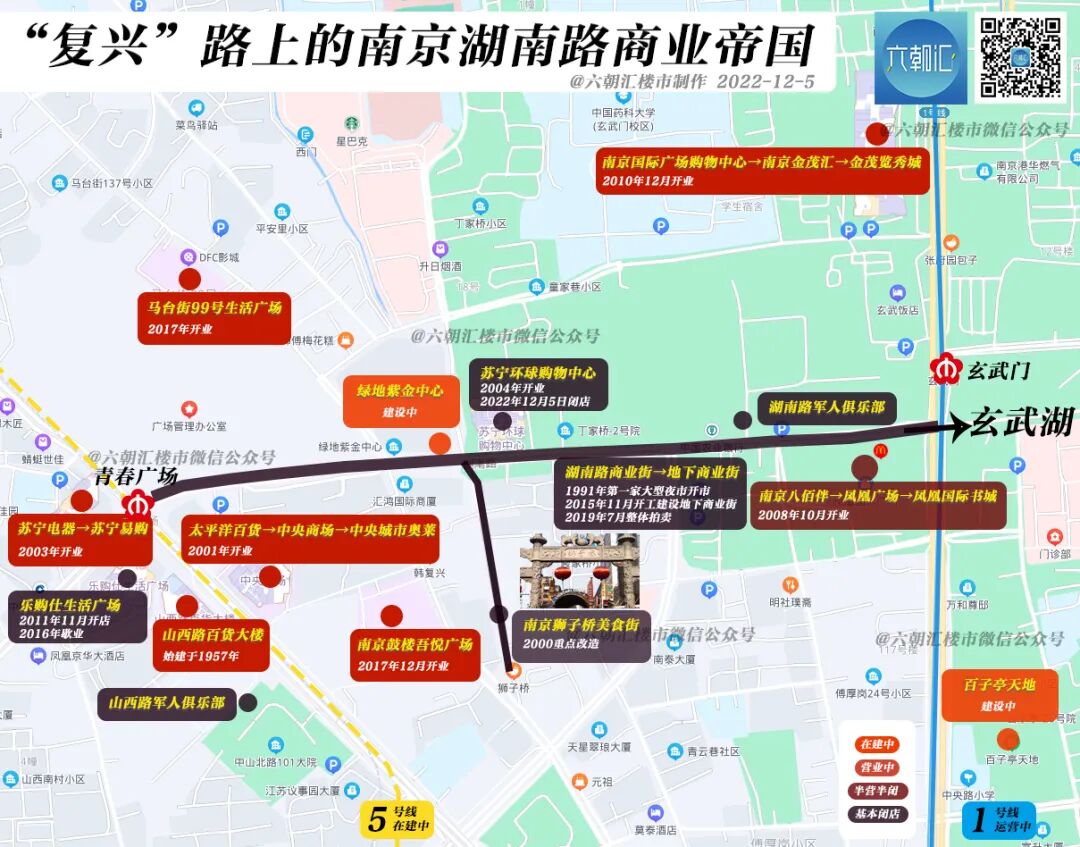 3. 据了解,湖南路地下商业街东西全长1030米,东接1号线玄武门,西连5号线山西路(在建),项目规划面积约4.2万㎡,建筑面积约9.1万㎡,其中商铺约8万㎡,约1万㎡。 深究湖南路商业街无法建成的原因,主要有三点: 16年间,军人俱乐部闭店关门、乐购仕生活广场歇业整改至今、八佰伴撤出凤凰升级、金茂收购国际广场升级的购物中心6年改了两次名开了两次业至今仍旧不温不火、狮子桥美食街送走大排档现在又送走小龙坎仅余几家小吃店勉强开业、现在,18岁的苏宁环球购物中心,黯然离场。 湖南路,泯然众人…… 有时候,不抱期望反而会迎来希望。 今年10月份,有网友注意到,瑞安房地产及XINTIANDI新天地品牌在南京的首个新天地项目——百子亭天地顺利封顶!湖南路,再添一员猛将! 修旧如旧的百子亭天地,未来将成为玄武湖畔历史与现代交融的开放式城市共享客厅: (效果图) 再往北,是继北京、苏州华贸中心之后,由华贸集团打造的第三座华贸中心,总建筑面积约45万㎡,以TOD模式锁定地理位置交通优势。 商业由精品购物中心、开放式商业街区、文化艺术区、Club组成,新场景、新商业的模式打造充满戏剧化的惊喜舞台。目前多楼栋建造进度非常明显,按照计划,预计明年(2023年)就能整体投入运营! 南京华贸中心效果图 湖南路本身—— 绿地退出之后的5号线,进度比以前快不少,按照计划明年就能建成。湖南路地下商业街现在主体已经竣工,一旦突破5号线这个梗结,湖南路地下城大概率会重燃希望! 还有湖南路上的军人俱乐部,包括山西路上的。 有消息称,之所以一直大面积空置,就是因为当前湖南路就算开业也挽救不了颓势,现在budui想等一个合适的时机打包,到时候交给合适的运营商,整合为成片成规模的商业,例如现在16000㎡的锦创书城。 还有与苏宁环球购物中心一街之隔的紫金中心,体量足足有50万方,目前多栋楼建造进度喜人,其以公园人文为主题的商业mall,已经能看到雏形: 现在的湖南路,并不全然都是绝望。 它承载了太多南京人的情怀,我们也不希望看着它离我们的记忆越来越远,更不相信,与时俱进的南京城,会留下这样一块疮疤在玄武湖畔影响观瞻;在主城中心,浪费这样大片的好地方。 南京,给力点!