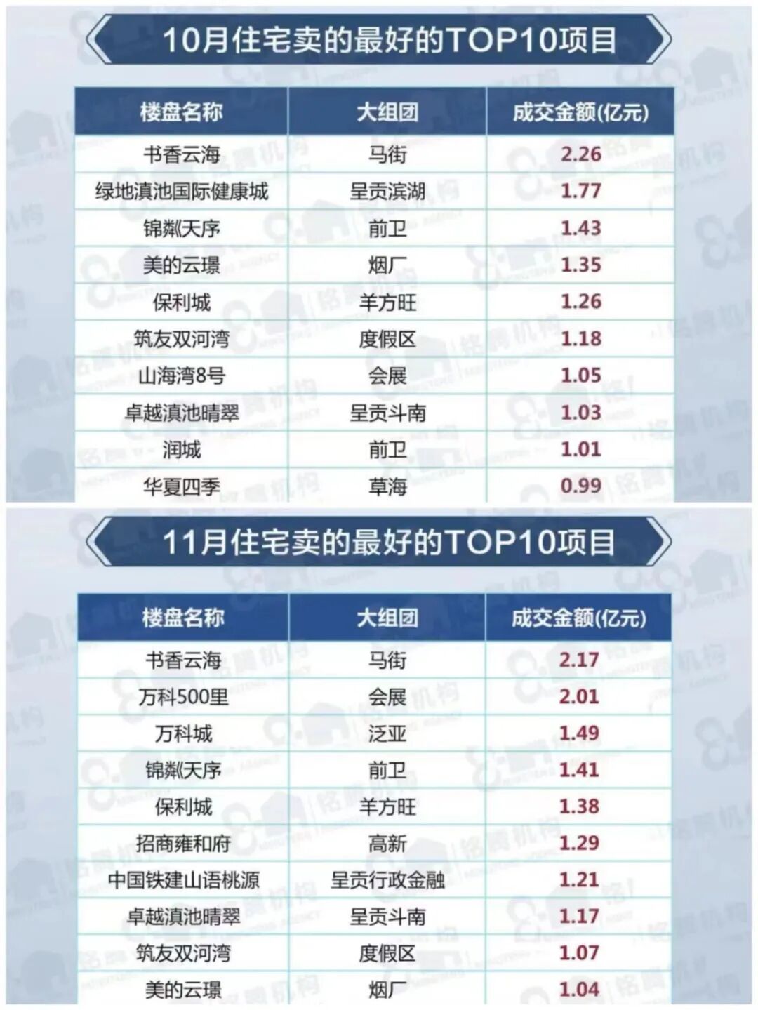 而万科的这一波降价,确实也给其带来了实实在在的销量,据铭腾数据统计,在10月的时候,销量TOP10中万科一个项目都没有,而11月,却有两个项目登上了榜单,尤其万科500里还在11月第4周成为了销冠。
