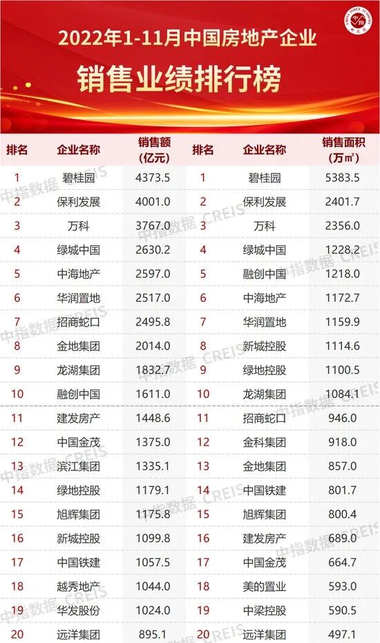 2022年1-11月销售业绩排行(部分:图片源于中指院)