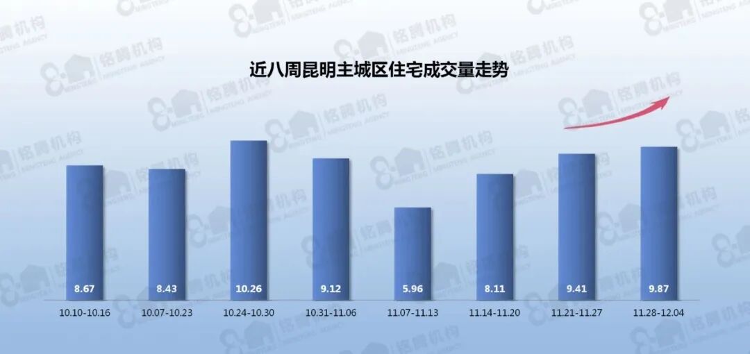 据铭腾数据统计,10月昆明主城销量约36万方,而11月仅成交了35万方,虽然整体成交量下滑,但从周数据来看,11月每周的成交量都是在稳步攀升的。