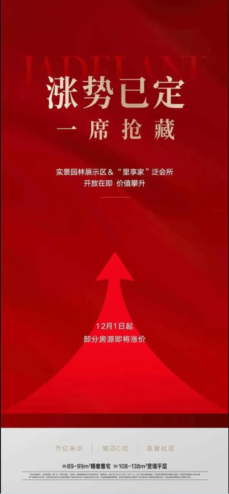 此外,金地云溪九境也在前段时间释放出即将于12月1日起涨价300元/平的消息,金地锦康湖山大境和碧桂园龙腾世家等也表示从12月起将上调价格。