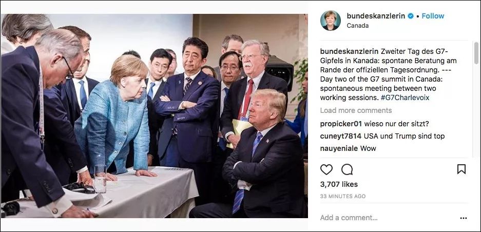 所以,也就有了前年加拿大G7峰会后,默克尔默默贴出了那张著名的“六大门派围攻光明顶”的照片。